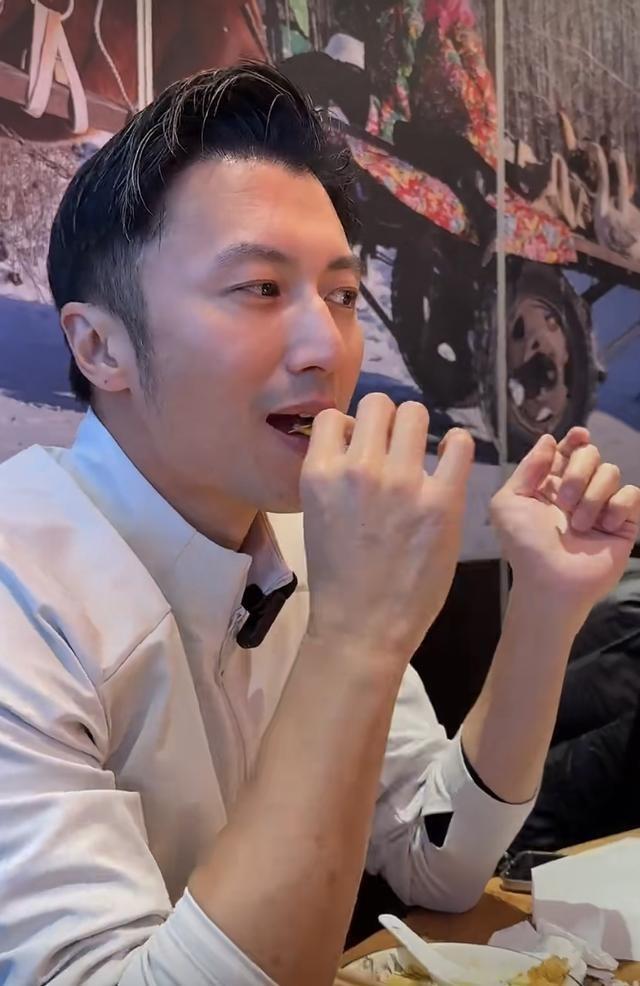 45岁的他,鬓角已有盐霜,街拍放大镜下毫无滤镜。但一支鹅腿在手,五官却活成了十五岁:眉毛跳,眼睛亮,连磕到牙都笑场。他似乎在借这一口热气,抵抗时间的催促。